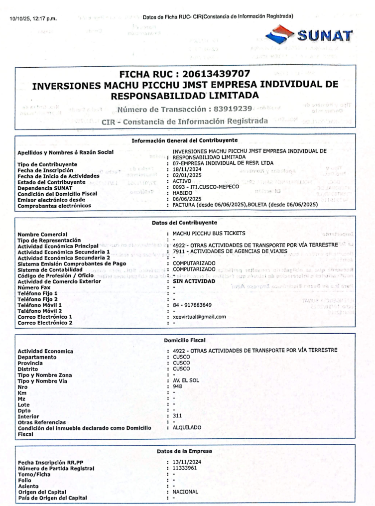 Somos una empresa local con oficina fisica en la ciudad del Cusco con un equipo local especializado en experiencias auténticas . Nacimos con una misión clara: ofrecer a cada viajero una conexión real con la historia, la cultura y la naturaleza de Cusco y sus alrededores. No somos intermediarios impersonales; somos operadores locales que conocen cada ruta, cada comunidad y cada detalle que transforma un simple tour en una experiencia memorable. Nuestra pasión por el territorio se refleja en cada servicio que brindamos y en la forma cercana con la que acompañamos a nuestros viajeros.